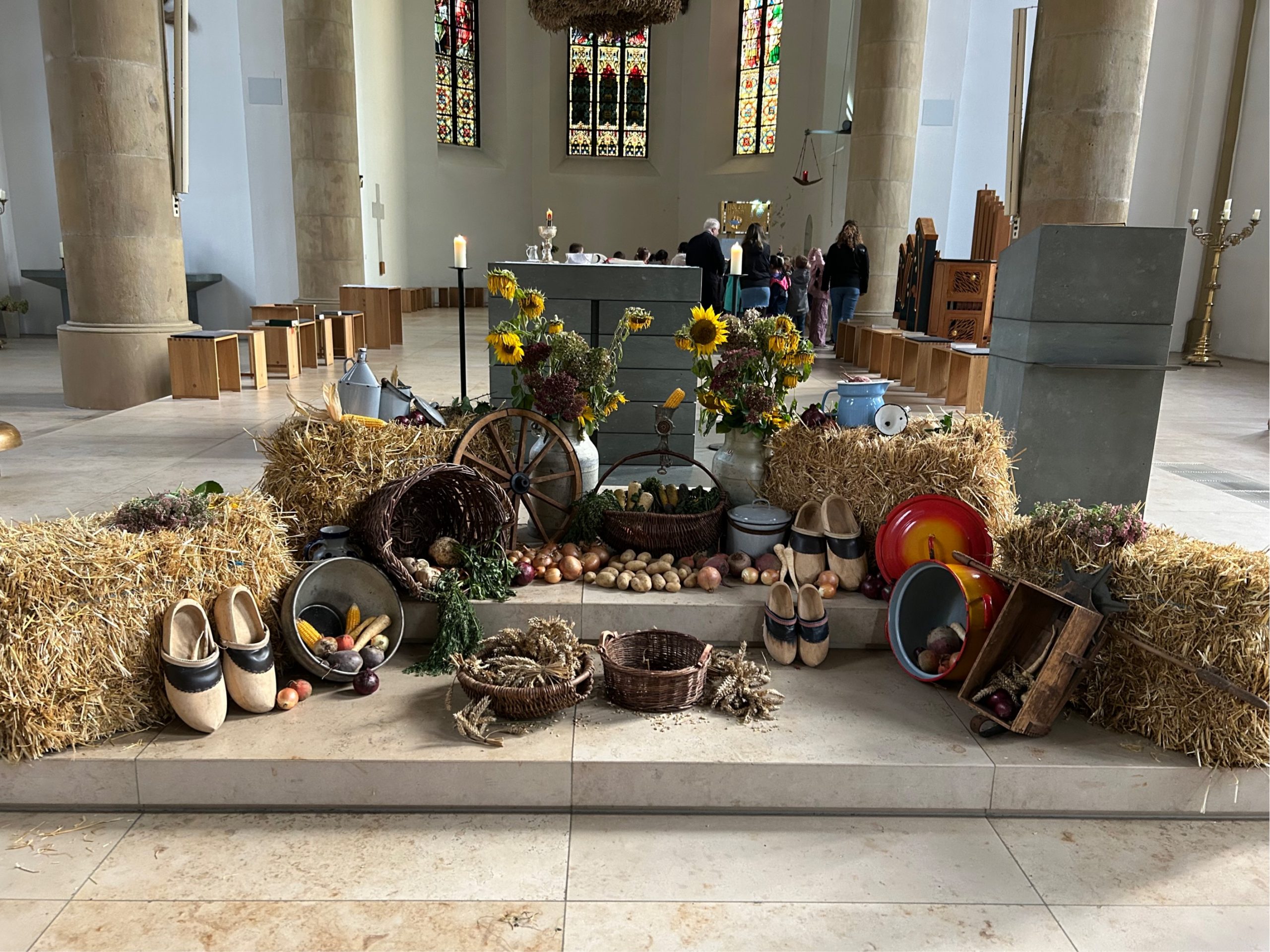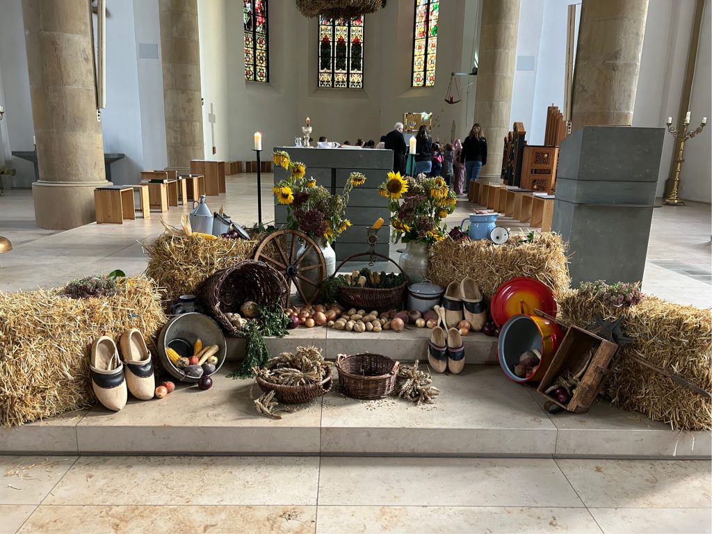 Der Altarraum war noch vom Erntedankfest geschmückt.