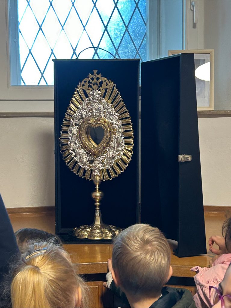In der Sakristei konnten die Kinder eine alte Monstranz bestaunen, die in feierlichen Gottesdiensten und bei Prozessionen zum Einsatz kommt.