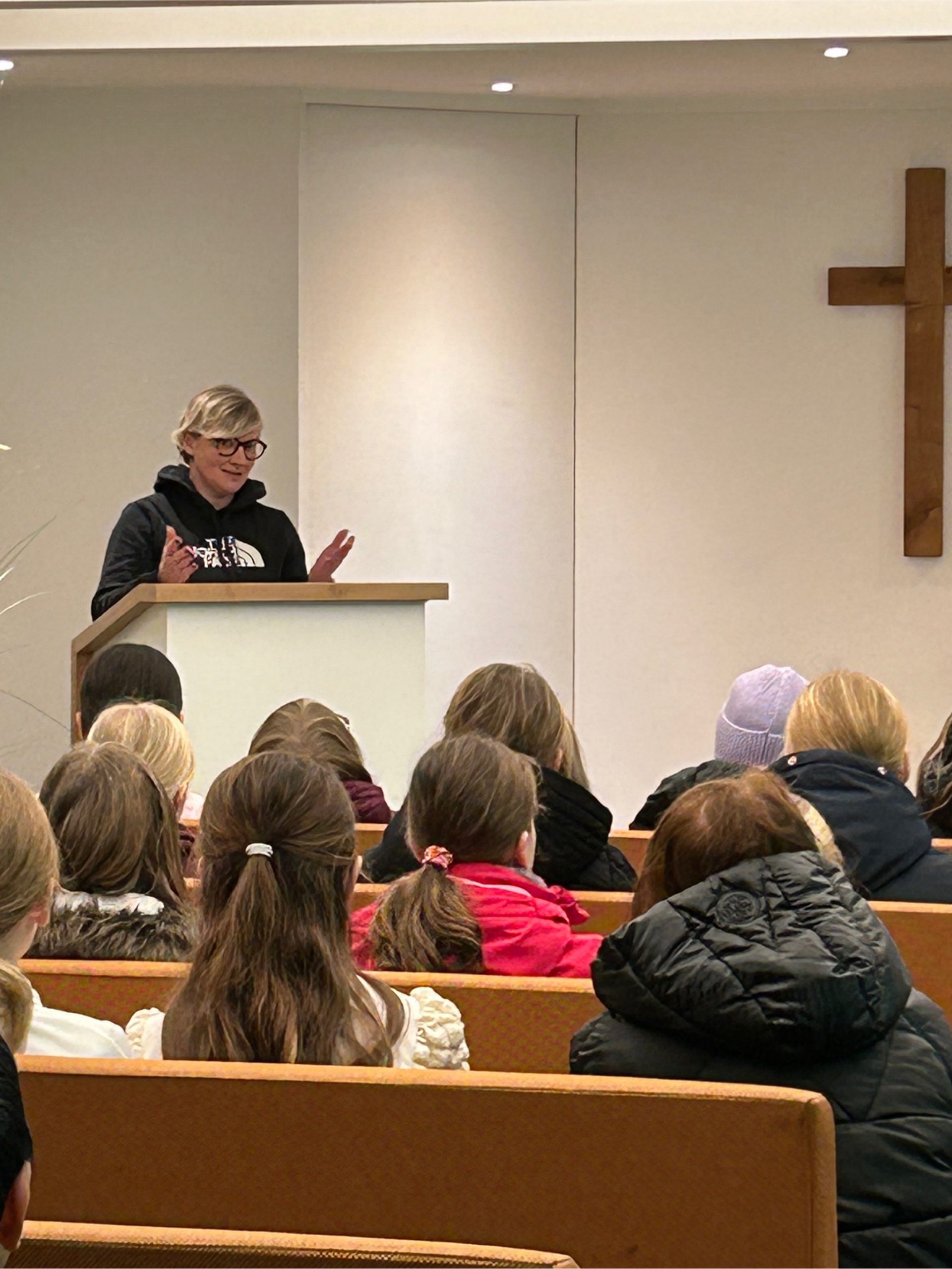 Drei Wochen nach Ihrer Einschulung trafen sich unsere 75 Erstklässler zu ihrer ersten ökumenischen Kirchenstunde in der St. Lucia Kirche mit Simone Hansen (ev. Diakonin) und Monika Scharf (kath. Religionslehrerin). Gemeinsam wurde gesungen, gebetet und der Geschichte von der Kindersegnung gelauscht.